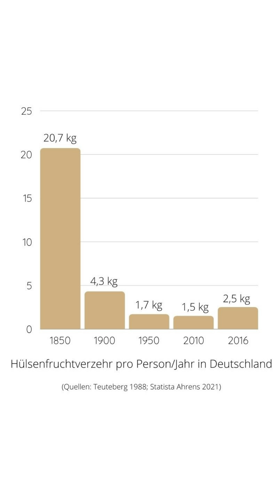 Konsum von Linsen, Bohnen, Kichererbsen und Co. in Deutschland ist in den letzten Jahren stark zurückgegangen. Während eine Person im Jahr 1850 im Schnitt 20,7kg Hülsenfrüchte pro Jahr gegessen hat, waren es 2010 nur noch 1,5kg.